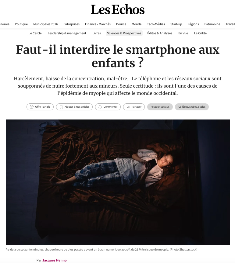 J’ai publié ce matin dans le quotidien Les Echos une enquête sur les conséquences de l’usage abusif que font du smartphone et des réseaux sociaux beaucoup de pré-ados et d’ados. Un problème qui concerne aussi bien les parents français que les familles anglaises, australiennes ou Californiennes : dans l’Hexagone, 42 % des 12-17 ans passent entre 2 et 5 heures sur leur smartphone, 9% d’entre eux y consacrent même plus de 5 heures par jour (source : Crédoc Baromètre du numérique – Edition 2025). Si – faute de pouvoir accéder aux données des Instagram, TikTok et autres Snapchat -, il y a encore débat scientifique sur l’impact des réseaux sociaux sur la santé mentale des jeunes, il n’y a pas photo pour leurs yeux : « La myopie évolutive chez les enfants est de plus en plus fréquente en raison d’un manque d’exposition au soleil et d’une augmentation du temps passé à regarder de près : plus les enfants vivent en ville, où ils sont moins à l’extérieur, et sont soumis à la pression scolaire qui les oblige à étudier intensément sur des livres ou des écrans, plus ils sont susceptibles de devenir myopes », résume Annegret Dahlmann-Noor, spécialiste de la myopie au Moorfields Biomedical Research Centre, à Londres. « Ce à quoi il faut ajouter les endormissements plus tardifs qui perturbent le cycle du sommeil et donc de la production de mélatonine et de dopamine, ce qui aggrave les myopies », précise Dominique Bremond-Gignac, chef du service d’ophtalmologie de l’hôpital universitaire Necker Enfants malades de l’APHP.
